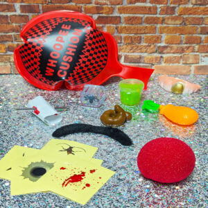 • Mustaches, whoopie cushions, poop, squirt rings, clown nose, teeth, ice cube bugs, fart putty, and so much MORE!